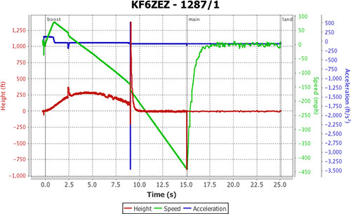 However, the booster unit performed very strangely. At first, I thought it was due to the flight being low and/or the acceleration being low, but if you look at the altitude data, you'll see that it's implausible. Also, the unit fired the ejection charge some time after it lawn-darted in.
