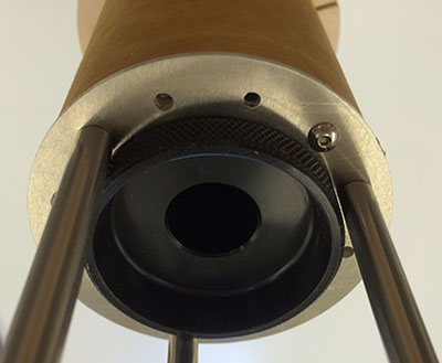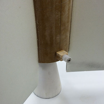 This plate rests on top of a plywood ring that forms the forward end of a small electronics bay and the struts bolt to the plywood ring and through the aluminum plate. The pins on the ends socket into matching holes in the base of the sustainer.