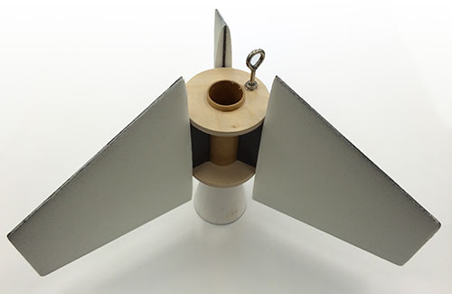 A prominent detail of the sustainer is the tail cone, made in three pieces of 3D printed plastic that fit between the fins. (Like the booster nozzle, these were made using Shapeways.)
