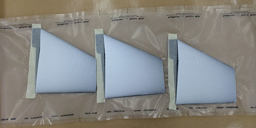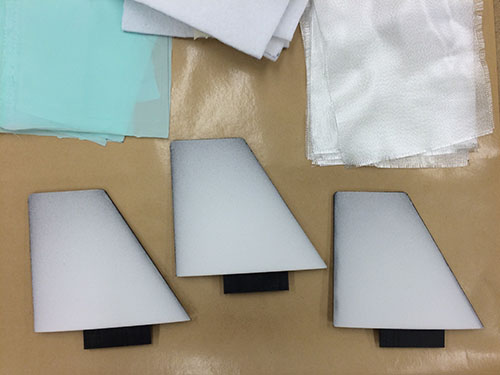 A light coat of epoxy was applied to the profiles and they were tacked in place with CyA. Excess was trimmed off with a knife and the the fins went into the vacuum bag to cure. Finally, a layer of 4oz. fiberglass was vacuum bagged to the surface to create a hard skin.