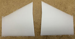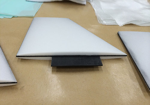 Above you can see a top view of the booster fins after bonding the profiles to the cores and getting ready to laminate fiberglass onto the surface. Below you can see a close-up of how the profile forms the compound curves on top of the core.