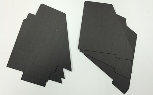 Above you can see the six cores cut out of carbon plate for the three booster and three sustainer fins. These were a straight-forward CNC routing cut-out operation, although it was the first time I'd cut carbon plate this way. Below you can see the fins test-fit into the rings cut in the sustainer (left) and booster (right).