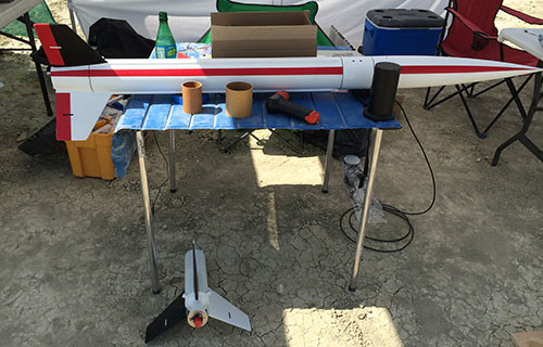 The rocket was mostly prepped on Friday, and then flew on Saturday, August 2nd, 2014 at the AERO-PAC Aeronaut launch. Here is the sustainer on the table ready to go, with the booster in the ground in front.