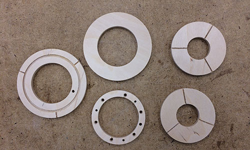 Above you can see the centering rings for the booster and sustainer. The smaller diameter booster CRs (on the right) are slotted for the fin cores and the sustainer rings (left and center) have to accomodate three different tubes, plus the interstage struts and motor retention.