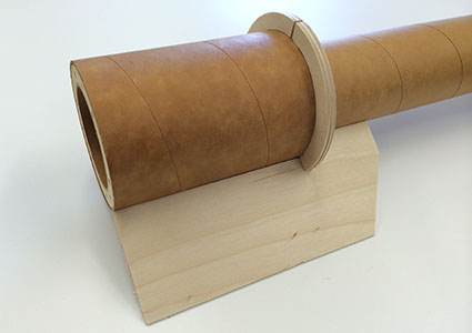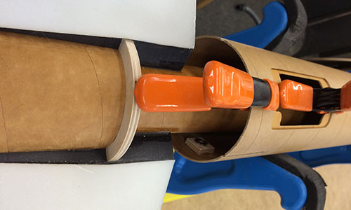 And with the 3" tube on over the aft core, a test-fit of the fin core, which slots into the forward centering ring and over the aft one. Note that this plywood piece is a stand-in for the actual fin core, which will be carbon fiber plate.