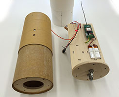 The payload cylinder was made in two halves, one of which served as a door for the payload ejection. The payload section was held shut by a wrap of fiberglass cord. A length of explosive Primacord along the seams of the cylinder would be detonated to release one half to fall free. Residual pressure in the sphere would force it from the payload section. Then air from the inner cylinder would fully inflate the sphere.