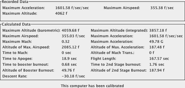 There were a few seconds of nail-biting before the sustainer lit since it took the J90 2.5s to come up to pressure. (See the HCX acceleration graph and flight summary and for details.) For the impatient, the sustainer reached 4060' (1237m) at 18.6s.
